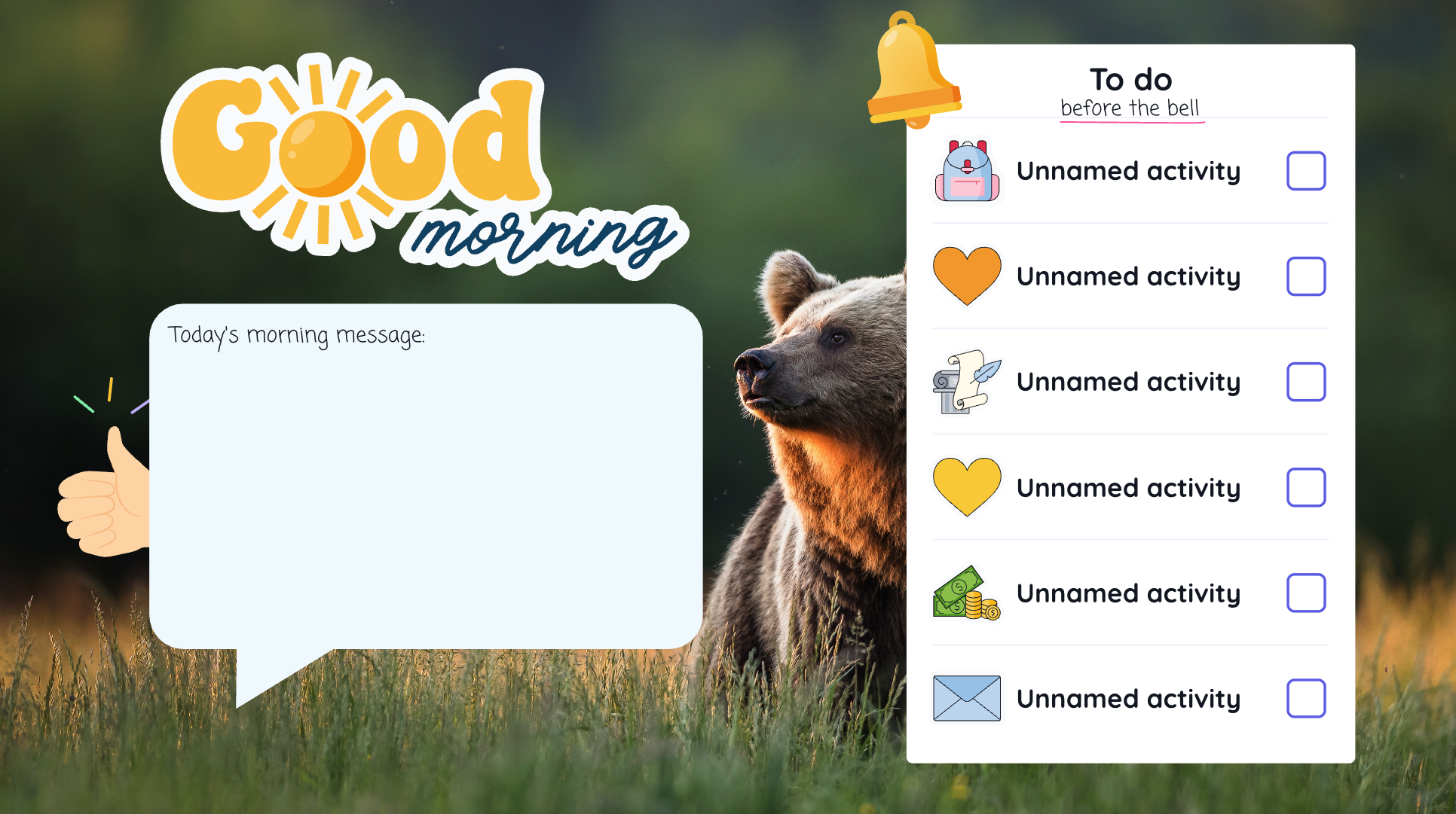 This screen is a cheerful start to the day, showing all the tasks that need to be completed before the bell while showing a morning message.