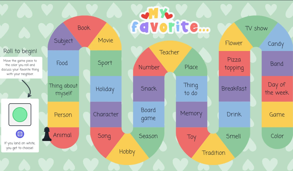 Students roll the dice, land on a category, and share their favorite thingsābuilding connections and classroom community.