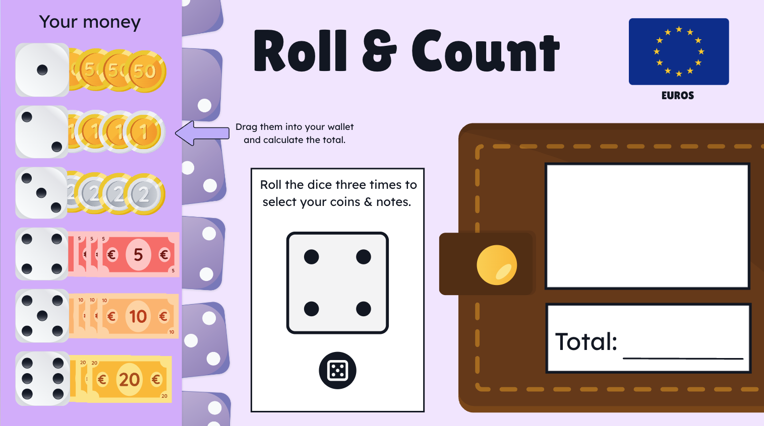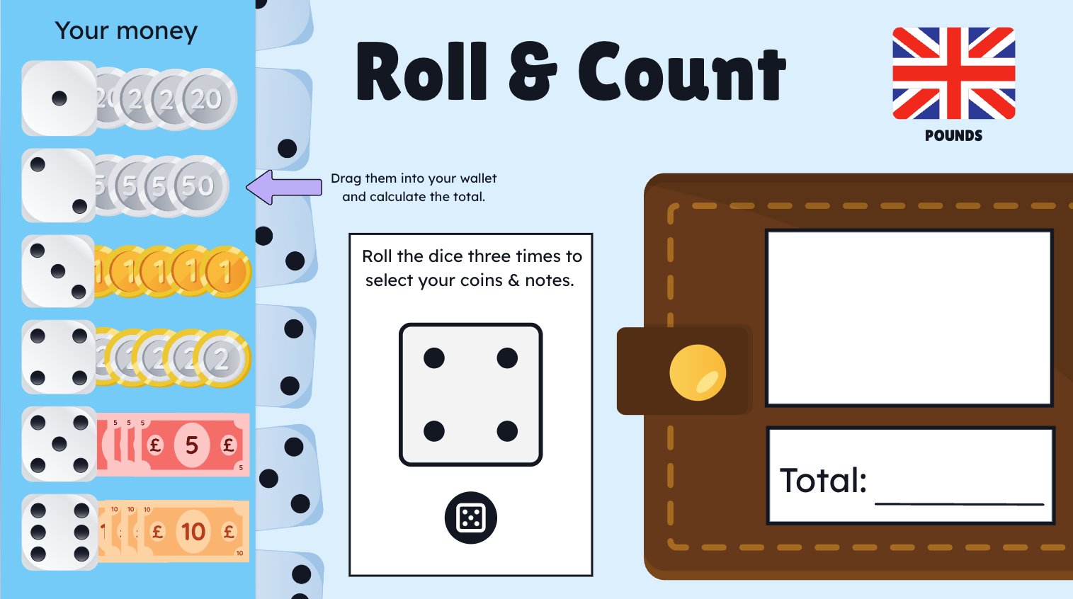This game helps students practice counting $, €, and £with an engaging drag-and-drop coin and note system. Students roll virtual dice three times, select the correct coins or notes based on their roll, and manually add them together — turning counting into a fun, active challenge.